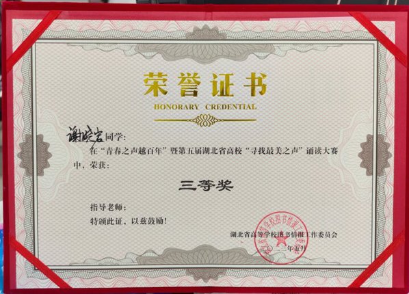本网讯 5月19日,“青春之声越百年”暨第五届湖北省高校“寻找最美之声”诵读大赛决赛在武汉大学图书馆举行。我校学子谢晓岩荣获大赛三等奖,谢晓岩朗诵的作品《祖国到底是什么(节选)》、武清阳与杨恩发朗诵的作品《红烛》、张梓庚朗诵的作品《相信未来》荣获“网络人气作品奖”。我校图书馆荣获“优秀组织奖”,图书馆张巧珍老师荣获“优秀领队奖”。