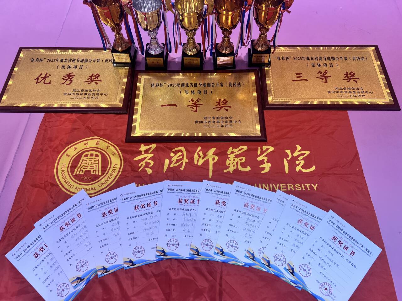 本网讯 4月19日至4月20日,“体彩杯”2025年湖北省健身瑜伽公开赛(黄冈站)在黄冈职业技术学院举行。我校健身瑜伽代表队发挥出色,喜摘院校组集体项目桂冠,包揽院校组男女混双冠、亚、季军,同时获得男单第三、四、七名,女双第六、八名。我校获院校组集体一等奖、三等奖及优秀组织奖。我校体育学院健身瑜伽男团队和留学生队分别受邀参加了开幕式展演。
